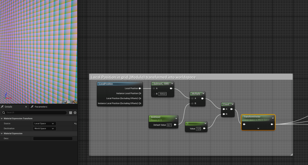 Here is the base for the pixel grid. The core is an Fmod node and transforming this into worldspace. (Subtracting -500 didn’t make it in the final shader, no worries). The idea is to use this grid later to subtract it from positions.