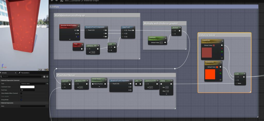 For the bubbles I used the worldspace position and moved it upwards. After that, it was important to scale that to fit the grid / pixel size, so that 0-1 is just as large as one pixel. In order to actually pixelate this, I subtracted the previously made pixel grid from that. Lastly, I multiplied it with a smaller number to scale the generated noise. This noise got then adjusted to look more like bubbles and the result got colored with a simple lerp.