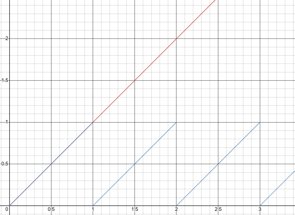 We can first truncate this value so that we always get a nice value from 0-1. That is as simple as using a modulo with a value of 1. What we get is visualized in the following picture. The red line is our stridewheel value and the blue line is the truncated value.