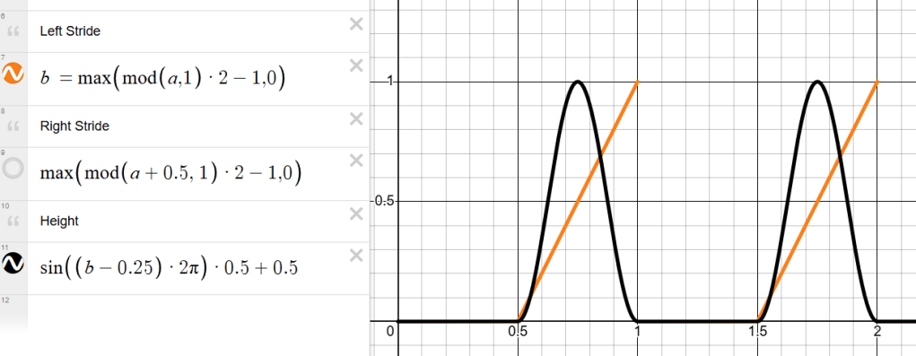 From this, we do a bit of fancy math, namely multiplying by two and subtracting 1 in order to bring the whole value into a -1 to 1 range. Capping this value at 0 leaves us with exactly what we want: The value stays 0 for half the stride, then moves linearly to 1 for the second half. The solution to do the same for the second leg, but with an offset? Simply add 0.5 before the whole calculation.